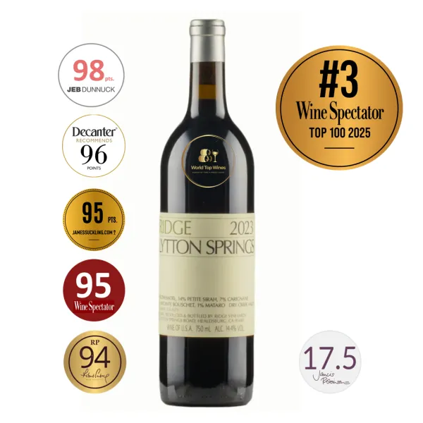Accolades for the 2023 Lytton Springs underscore its status as one of Ridge’s benchmark wines. It received 96 points from Decanter and Zinfandel Chronicles, and 95 points from Wine Spectator, James Suckling, Wilfred Wong, and Owen Bargreen. Virginie Boone of JebDunnuck.com also awarded it 98 points, praising its depth and precision. Wine Spectator ranked it #3 Wine of the Year in 2025, while James Suckling included it in his Top 100 Wines of the USA. With its critical recognition and pedigree, the 2023 Lytton Springs stands as a quintessential expression of Dry Creek Valley terroir and Ridge’s mastery of Zinfandel-based blends, celebrated for both its immediate appeal and its potential to age gracefully.